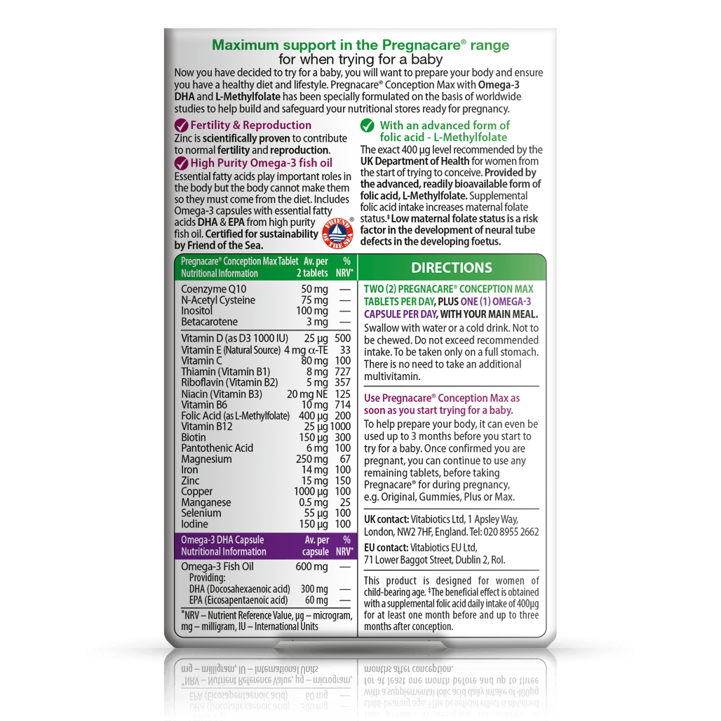 Pregnacare Conception Max has been developed based on scientific research to provide maximum ‘before pregnancy’ support in the Pregnacare range.